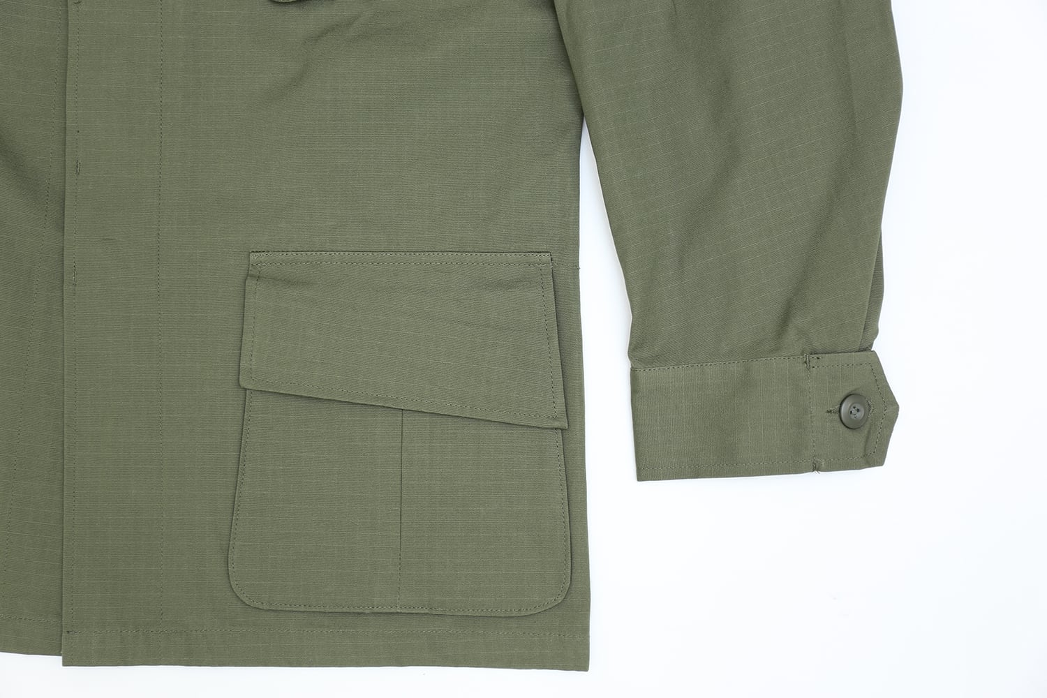 フロントポケットのボタンは向き出ずに内側に隠すボタンで、生地は100% Cotton Rip Stopの薄地で破れ防止の素材になりました。