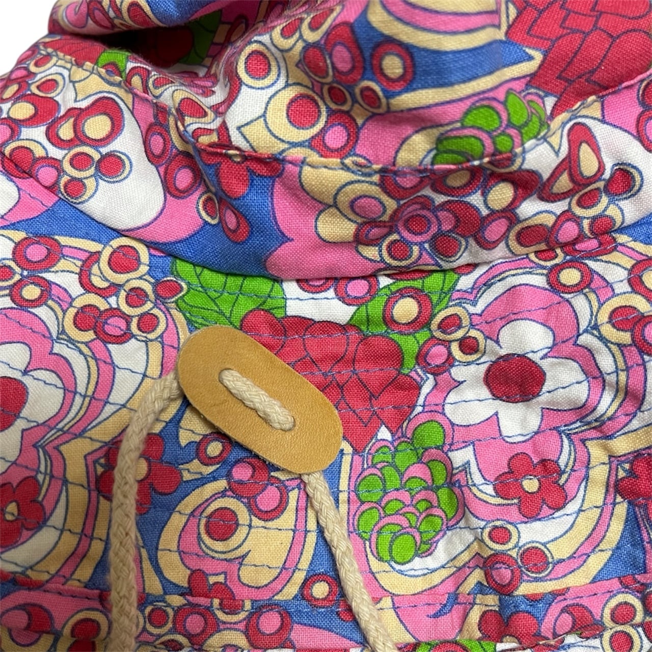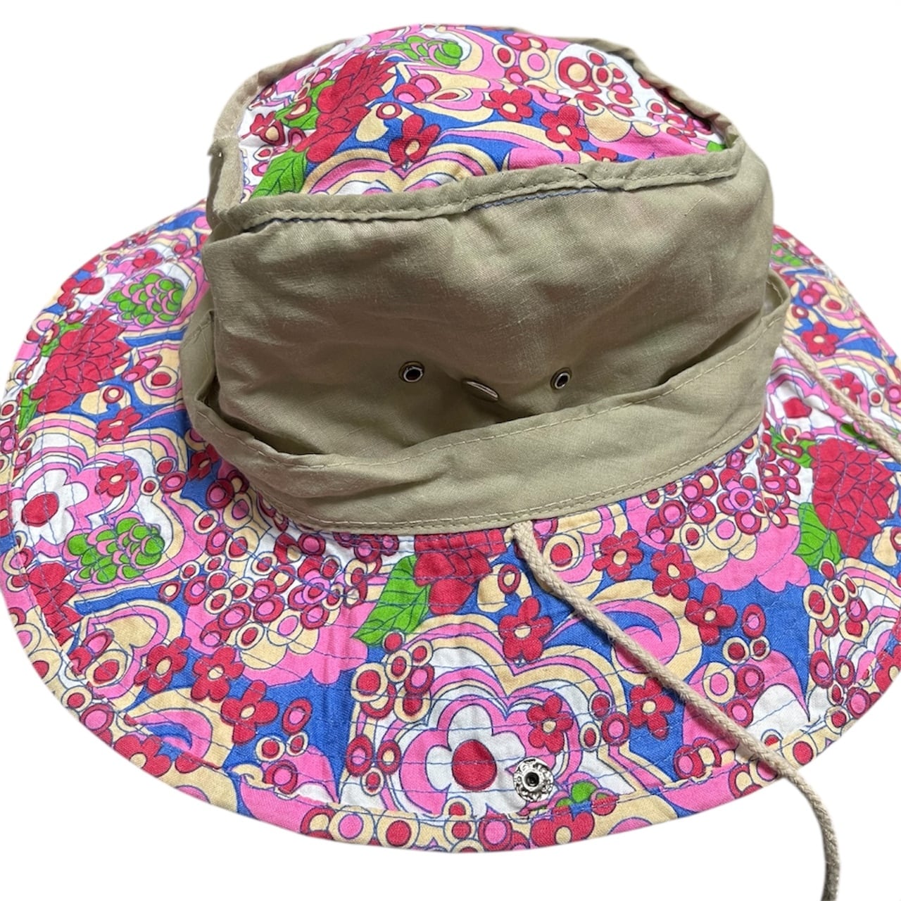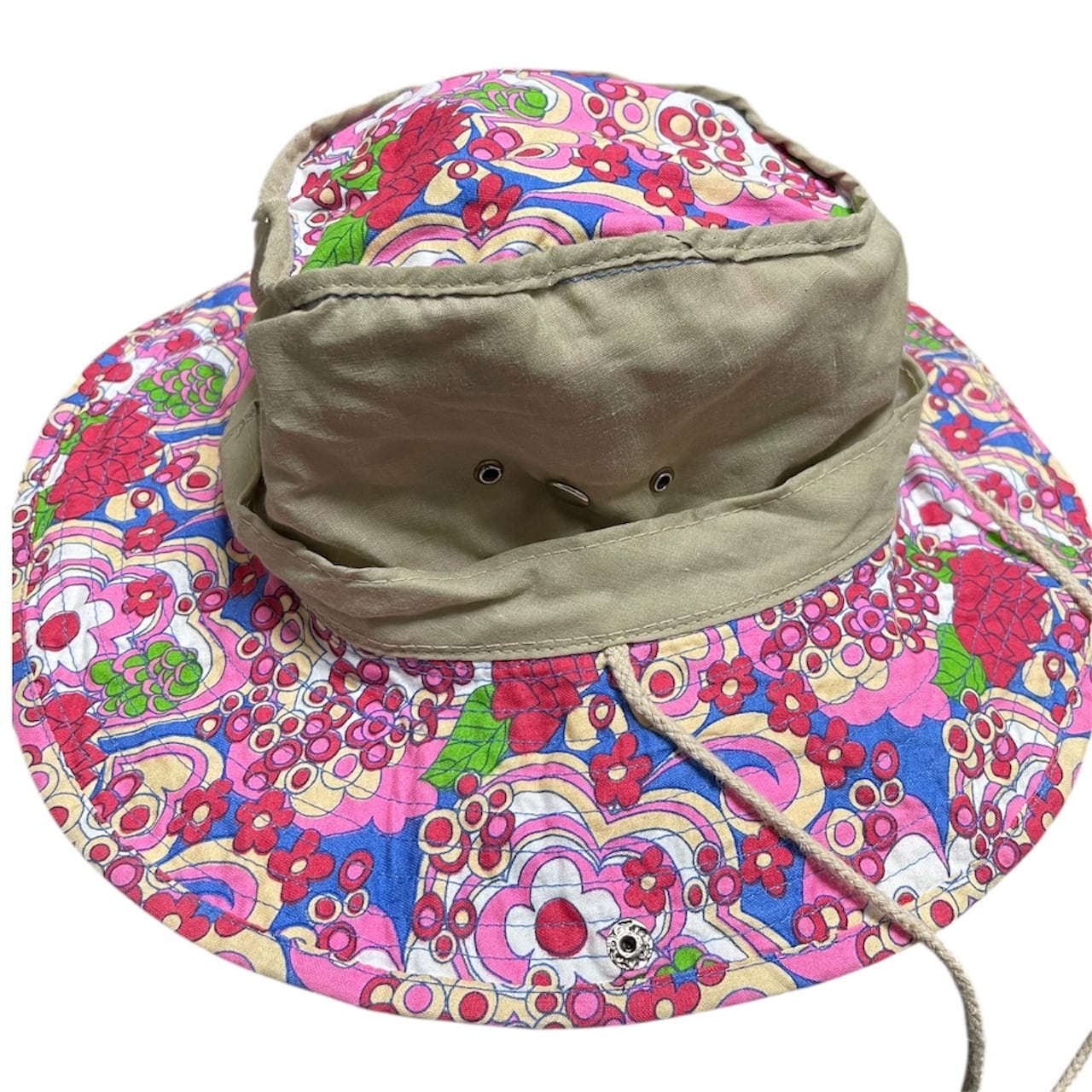 ※特に1967–72年に流行した「Flower Power」「Hippie Pattern」裏側がベージュのプレーンウィーブ。民間サイケデリック柄ブッシュハット(Hippie / Flower Power era)