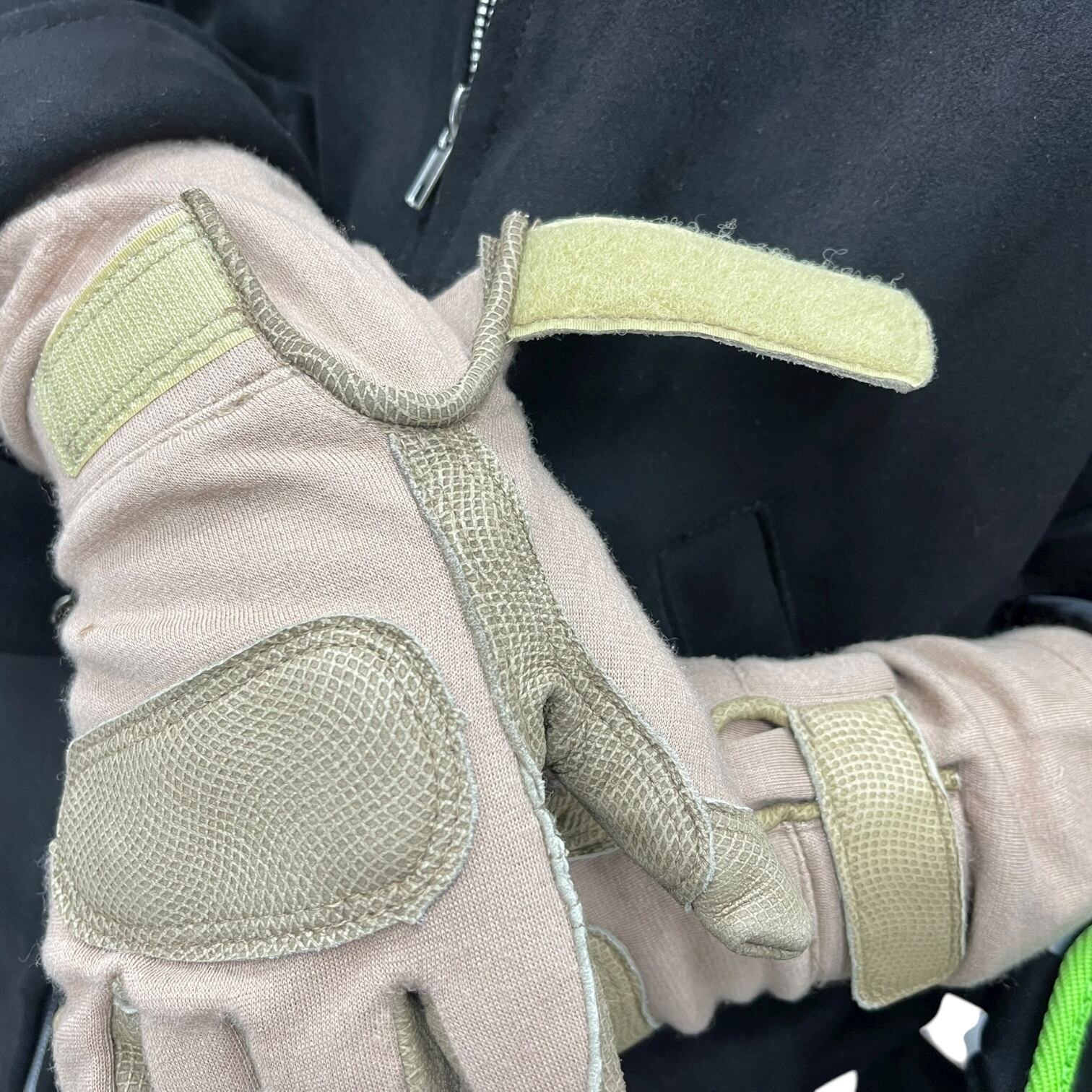 銃器操作や車両操作時に滑りにくい。手首ベルクロストラップでしっかり固定の耐火手袋。デットストック。そして、戦闘服(FRACUやMCCUUなど)の袖に重ねて火や破片の侵入を防げます。